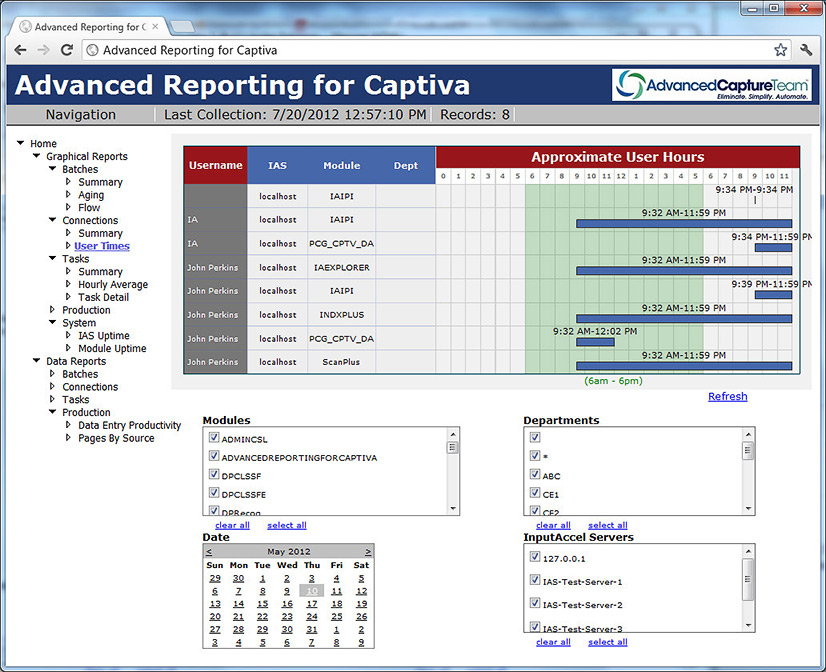 The Advanced Reporting Module for Captiva is an Operational Management utility for the EMC Captiva System. The data model, reports and requirements have emerged from hundreds of Captiva implementations. Those implementations ranged from small volume facilities with one or two scanners, and four to five people whom perform all tasks to large processing centers, receiving mail, faxes and email, processing hundreds of thousands of papers per day and staffs of hundreds. From this the following key features of the Advanced Reporting Module were derived: